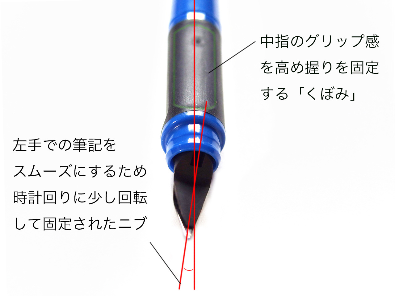 では、さっそく「左きき用万年筆」を左利き用たらしめる構造について解説してみましょう。はじめに以下の図をご覧ください。