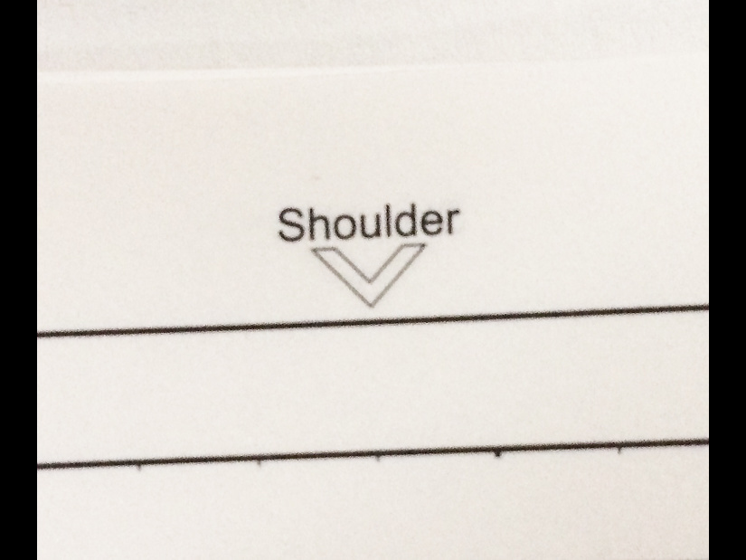 ちなみに図版で説明されている「^Shoulder」は、各ページの最上部に印刷された、ノートと肩との位置関係をチェックするためのマークです。部分拡大したものが以下の写真です。