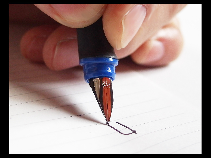 万年筆の本体を支える中指を左手のときと同じくグリップのくぼみに置くと、ペン先がスムーズな書字ではあり得ない角度で紙に当たってしまい、上手に書けません。左利きの人が初めて万年筆を持ったとき経験する、あの“ペン先の引っかかり”に四六時中なやまされてしまうのです。