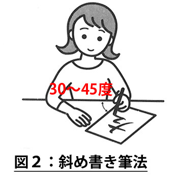 左手で筆を持って書道を習うときの姿勢は基本的には右手の場合と同じ。図1のように筆先と紙のなす角度を右手の場合と同じようするのがコツです。この角度は非常に大切で、筆先が15-20度ぐらい傾けないと筆の毛がササクレだち、上手な字が書けなくなってしまうのです。