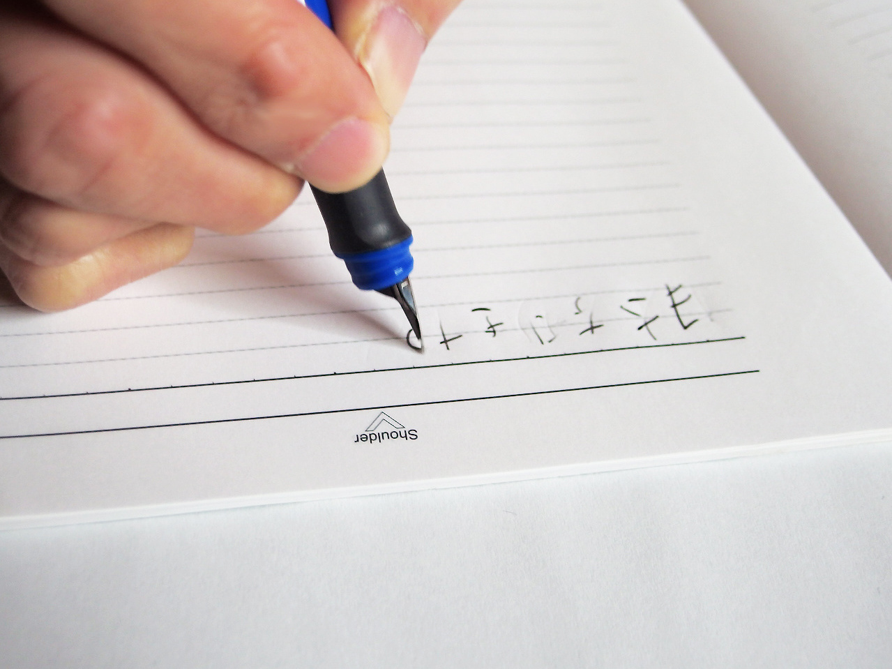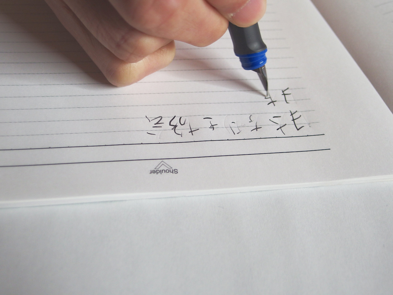 万年筆の本体を支える中指を左手のときと同じくグリップのくぼみに置くと、ペン先がスムーズな書字ではあり得ない角度で紙に当たってしまい、上手に書けません。左利きの人が初めて万年筆を持ったとき経験する、あの“ペン先の引っかかり”に四六時中なやまされてしまうのです。