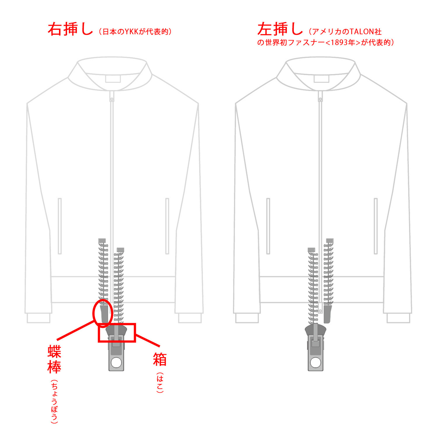 ファスナーの「蝶棒」と呼ばれる部分を、向かって右側にある「箱」で受ける仕様を「右挿し」、その逆を「左挿し」と言うらしく、日本では多くの場合、右手で蝶棒を箱に挿して、左手でファスナーを上げる右利き仕様になっている。これが、まれに左挿しになっていることがある。主に、海外製品の場合だ。